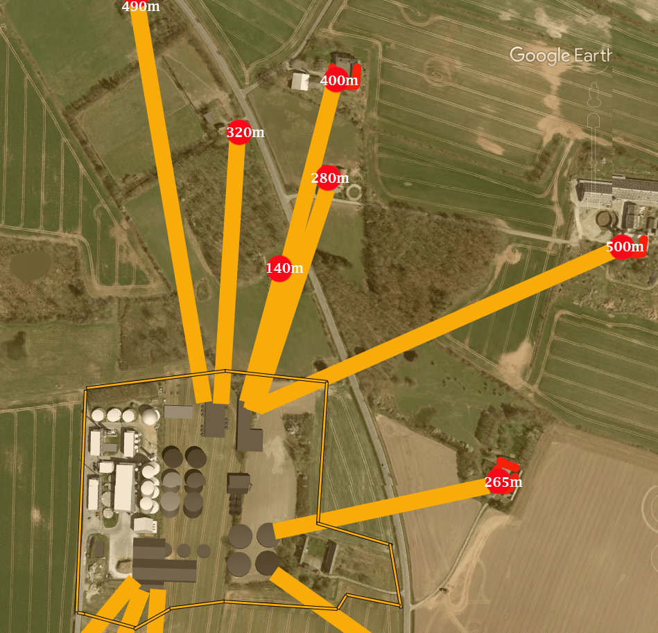 4. PLACERINGEN ER PROBLEMATISK Udvidelsen er planlagt alt for tæt på beboelse. Der findes ingen afstandskrav til boliger og bebyggelser for biogasanlæg. Men når man planlægger, anbefaler Miljøministeriet at holde en minimumsafstand på 500 meter til nærmeste bebyggelse og 300 m til den nærmeste bolig.